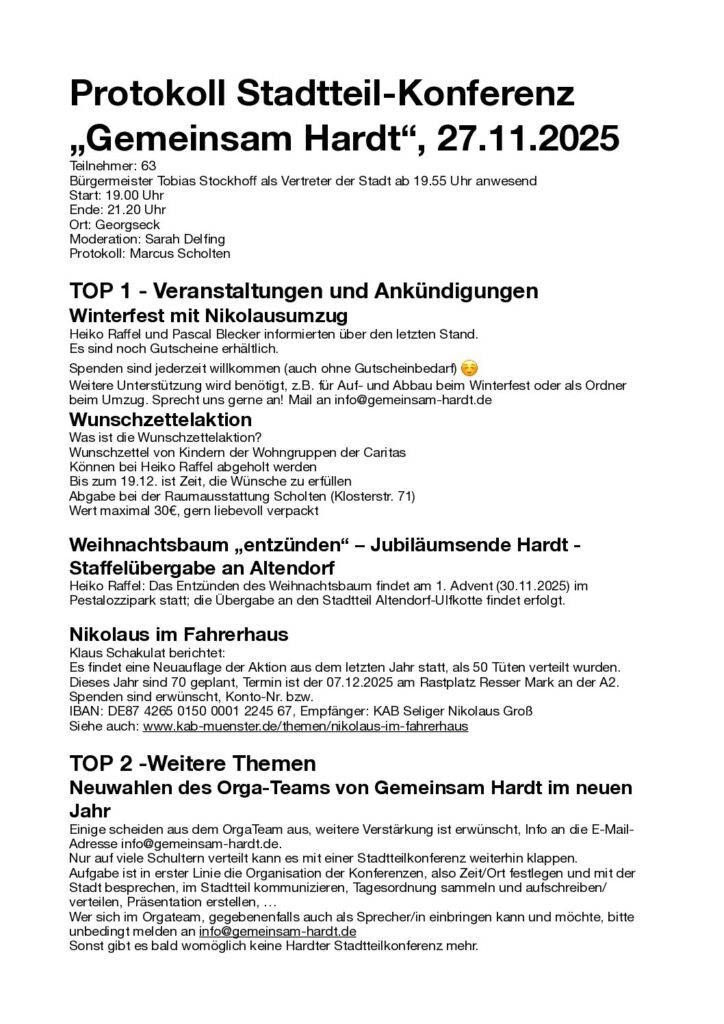 Anbei das Protokoll der letzten Stadtteilkonferenz Gemeinsam Hardt im Bürgerbahnhof Dorsten vom 7.11.24